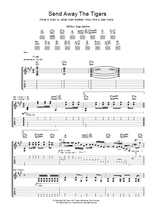 Download or print Manic Street Preachers Send Away The Tigers sheet music, chords and digital score arranged for Guitar Tab. This Rock score includes 6 page(s).