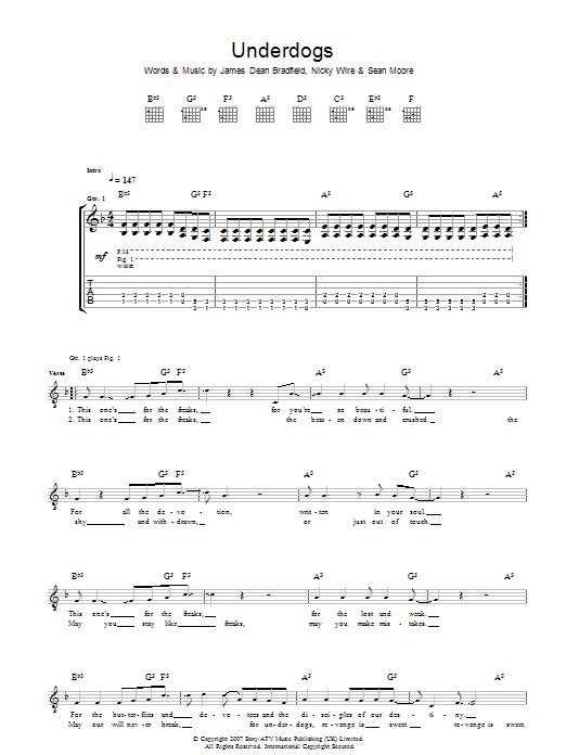 Download or print Manic Street Preachers Underdogs sheet music, chords and digital score arranged for Guitar Tab. This Rock score includes 4 page(s).