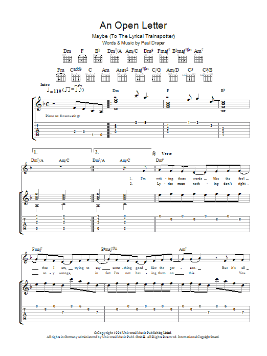 Download or print Mansun An Open Letter sheet music, chords and digital score arranged for Guitar Tab. This Rock score includes 7 page(s).