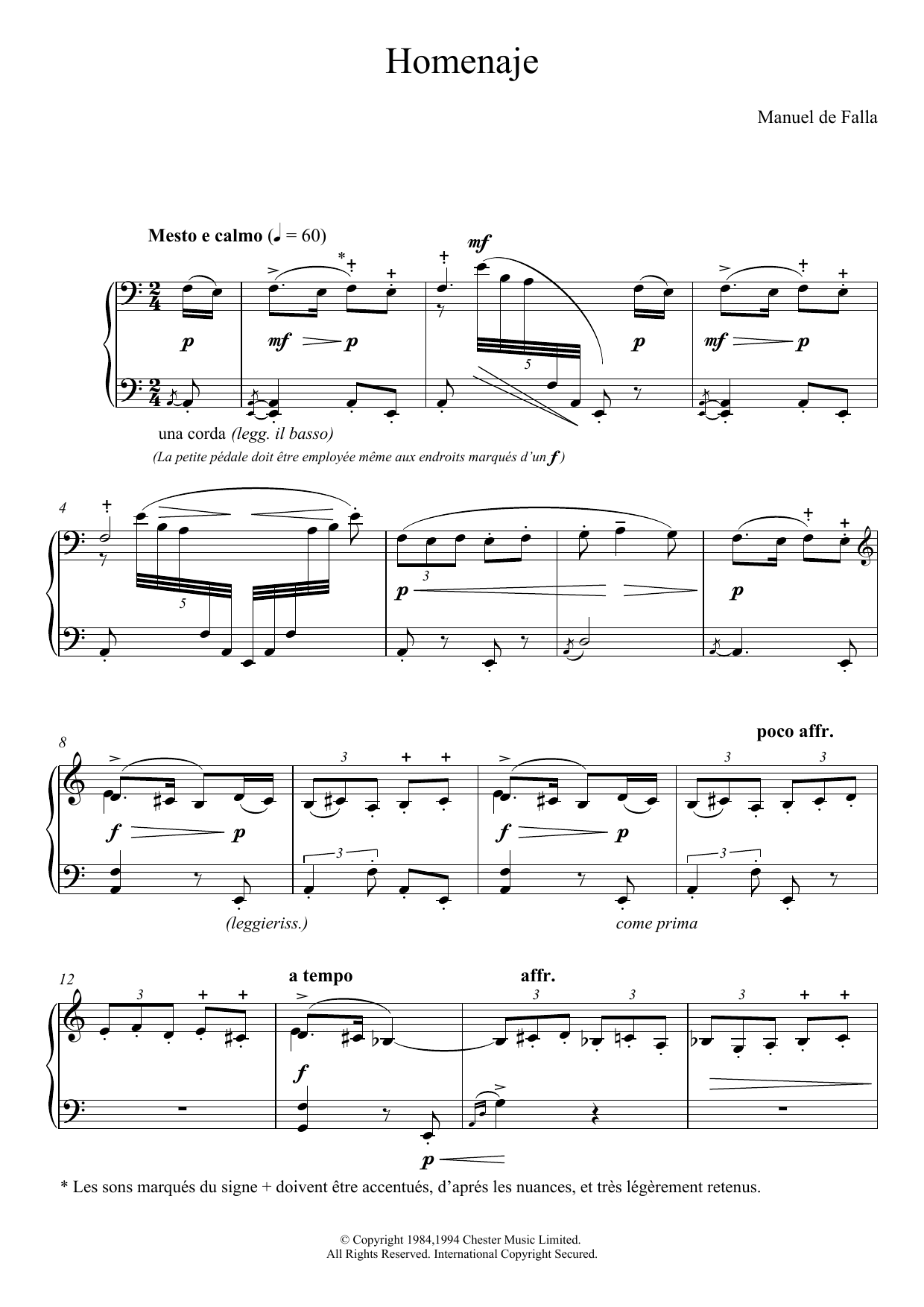 Download or print Manuel De Falla Homenaje sheet music, chords and digital score arranged for Piano Solo. This Classical score includes 4 page(s).