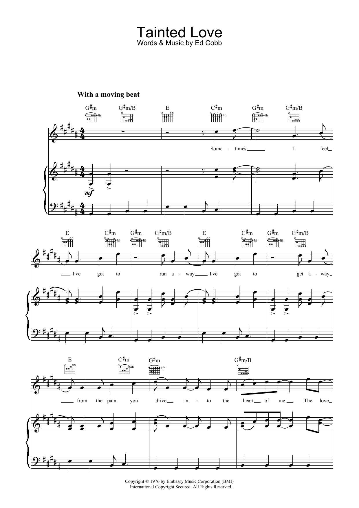Download or print Marc Almond Tainted Love sheet music, chords and digital score arranged for Piano, Vocal & Guitar Chords (Right-Hand Melody). This Pop score includes 4 page(s).