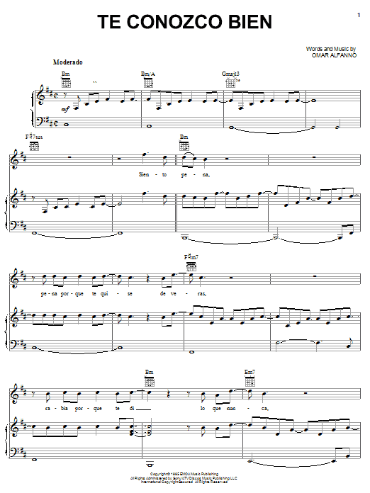 Download or print Marc Anthony Te Conozco Bien sheet music, chords and digital score arranged for Piano, Vocal & Guitar Chords (Right-Hand Melody). This Latin score includes 7 page(s).