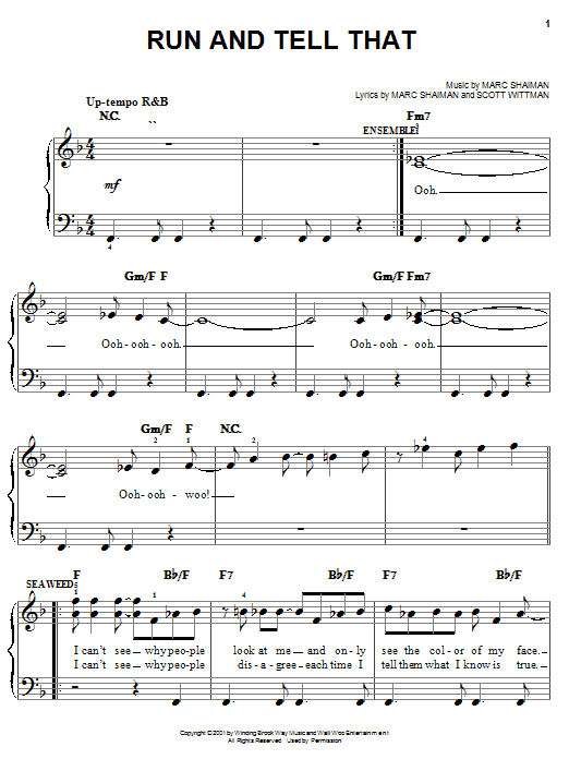 Download or print Marc Shaiman Run And Tell That sheet music, chords and digital score arranged for Piano, Vocal & Guitar Chords. This Musical/Show score includes 9 page(s).