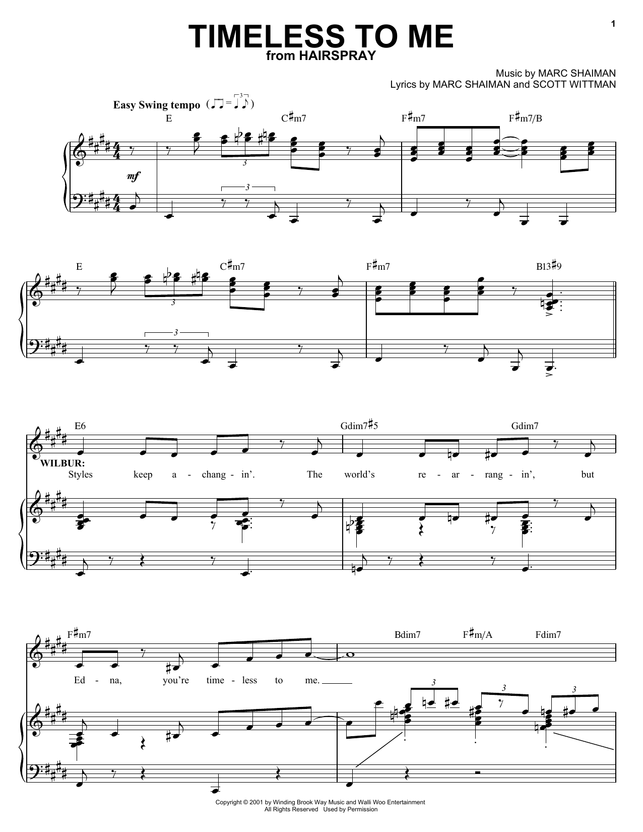 Download or print Marc Shaiman Timeless To Me sheet music, chords and digital score arranged for Piano & Vocal. This Classical score includes 9 page(s).