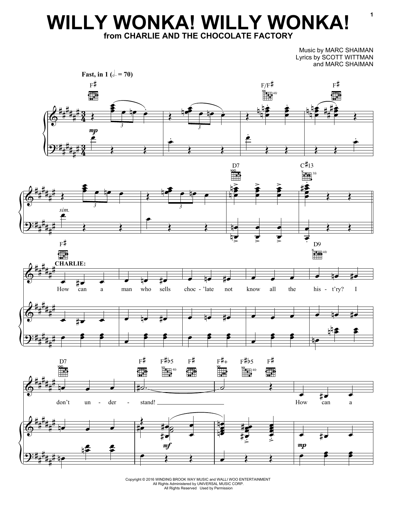 Download or print Marc Shaiman Willy Wonka! Willy Wonka! sheet music, chords and digital score arranged for Piano & Vocal. This Broadway score includes 8 page(s).