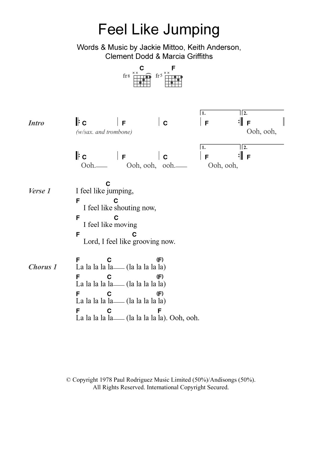 Download or print Marcia Griffiths Feel Like Jumping sheet music, chords and digital score arranged for Guitar Chords/Lyrics. This Reggae score includes 2 page(s).
