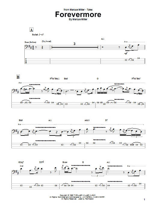 Download or print Marcus Miller Forevermore sheet music, chords and digital score arranged for Bass Guitar Tab. This Jazz score includes 7 page(s).