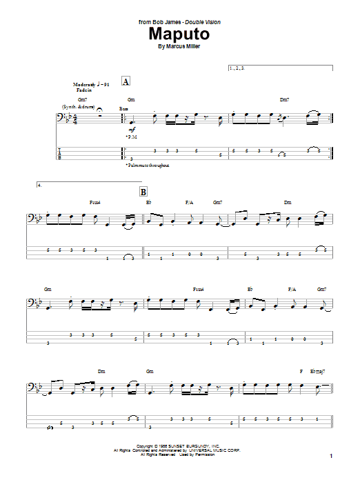 Download or print Marcus Miller Maputo sheet music, chords and digital score arranged for Bass Guitar Tab. This Jazz score includes 10 page(s).