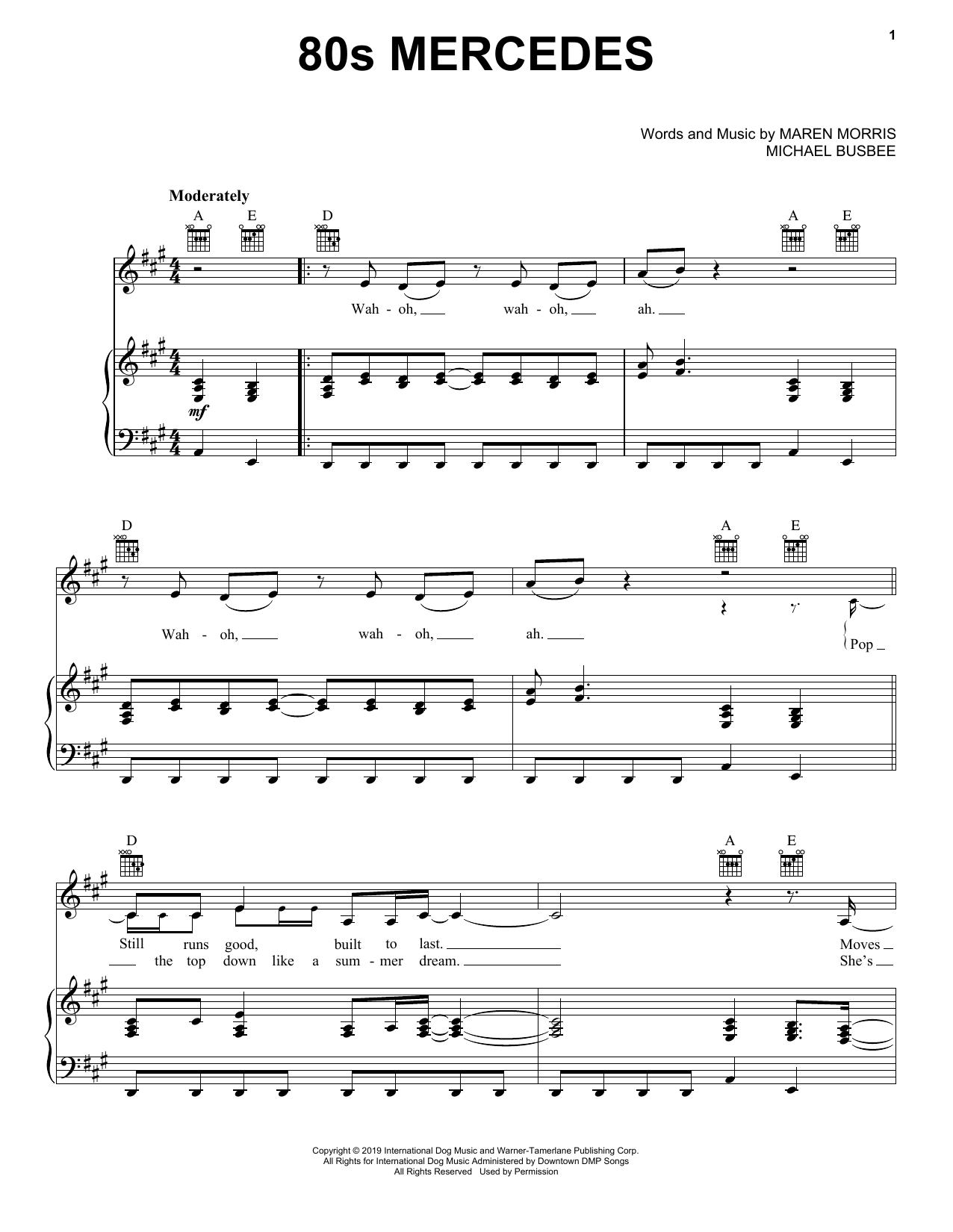 Download or print Maren Morris 80s Mercedes sheet music, chords and digital score arranged for Piano, Vocal & Guitar Chords (Right-Hand Melody). This Country score includes 5 page(s).