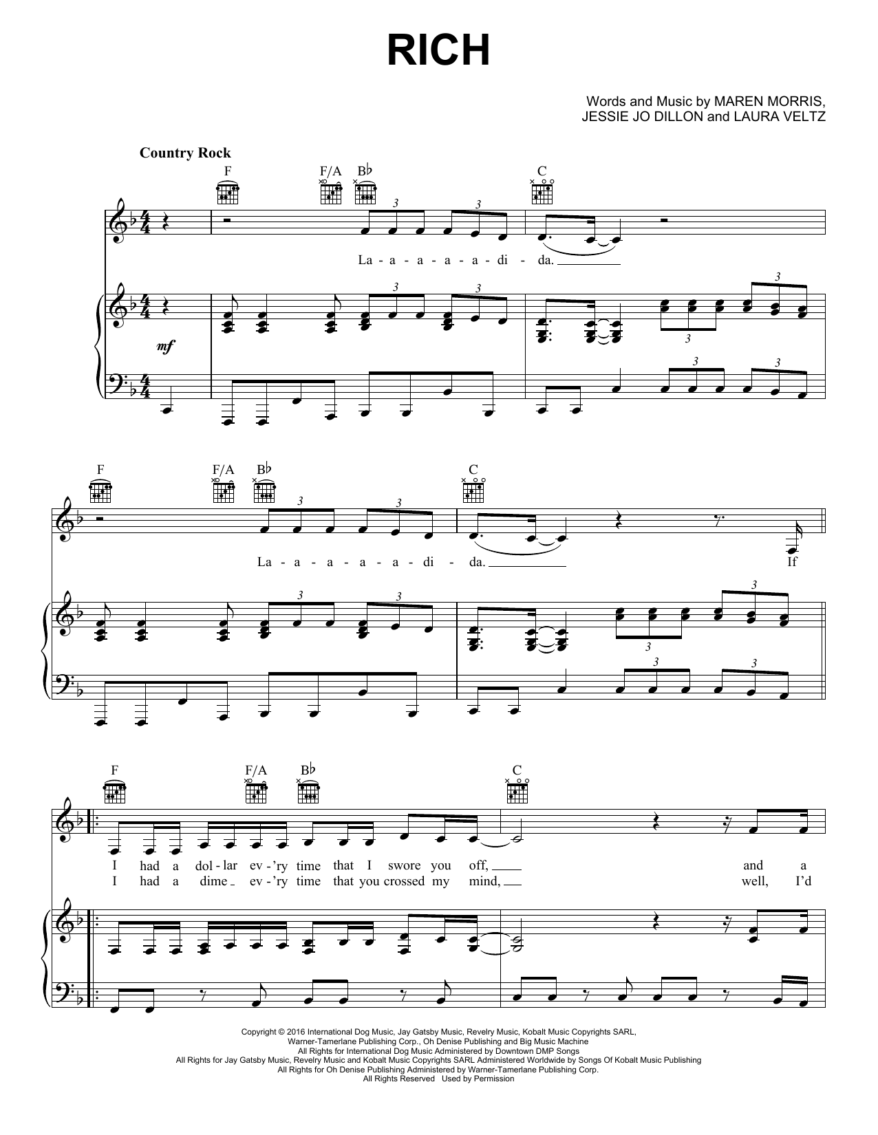 Download or print Maren Morris Rich sheet music, chords and digital score arranged for Piano, Vocal & Guitar Chords (Right-Hand Melody). This Pop score includes 6 page(s).
