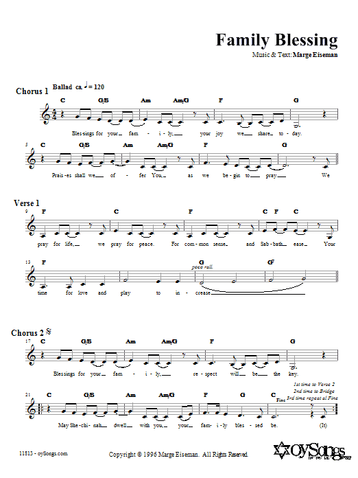 Download or print Marge Eiseman Family Blessing sheet music, chords and digital score arranged for Lead Sheet / Fake Book. This Traditional score includes 2 page(s).