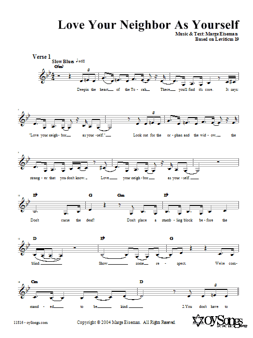 Download or print Marge Eiseman Love Your Neighbor As Yourself sheet music, chords and digital score arranged for Lead Sheet / Fake Book. This Traditional score includes 3 page(s).