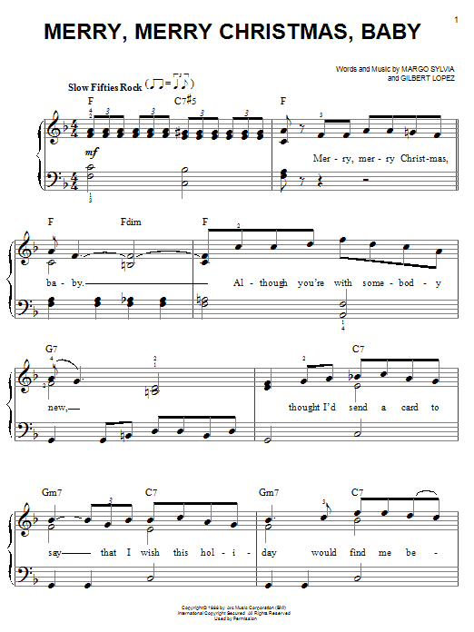 Download or print Margo Sylvia Merry, Merry Christmas, Baby sheet music, chords and digital score arranged for Piano, Vocal & Guitar Chords (Right-Hand Melody). This Christmas score includes 5 page(s).