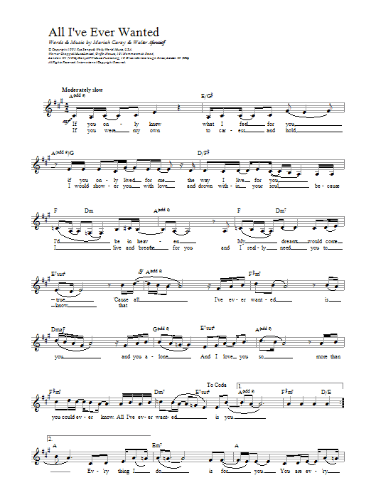 Download or print Mariah Carey All I've Ever Wanted sheet music, chords and digital score arranged for Piano, Vocal & Guitar Chords (Right-Hand Melody). This Pop score includes 4 page(s).
