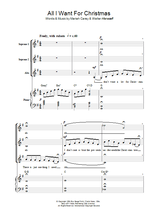 Download or print Mariah Carey All I Want For Christmas Is You (arr. Berty Rice) sheet music, chords and digital score arranged for SSA Choir. This Christmas score includes 12 page(s).