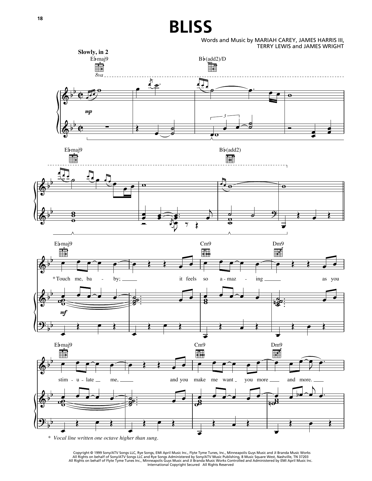 Download or print Mariah Carey Bliss sheet music, chords and digital score arranged for Piano, Vocal & Guitar Chords (Right-Hand Melody). This Pop score includes 10 page(s).