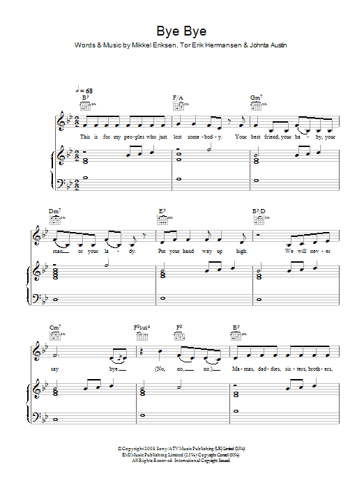Download or print Mariah Carey Bye Bye sheet music, chords and digital score arranged for Piano, Vocal & Guitar Chords (Right-Hand Melody). This Pop score includes 9 page(s).