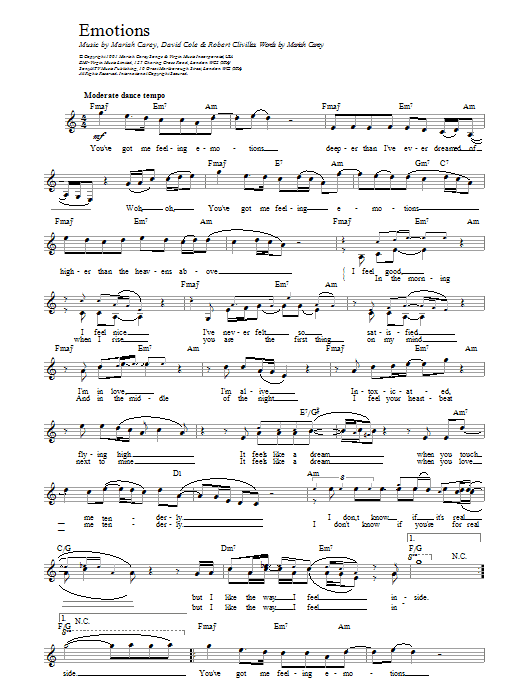 Download or print Mariah Carey Emotions sheet music, chords and digital score arranged for Easy Piano. This Pop score includes 7 page(s).