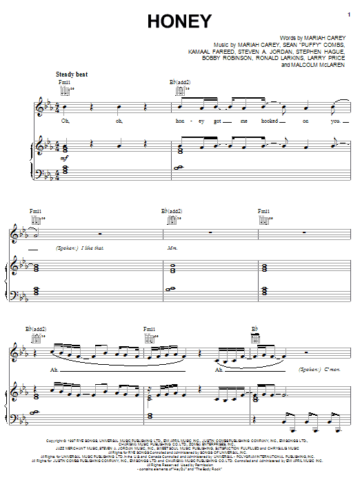 Download or print Mariah Carey Honey sheet music, chords and digital score arranged for Piano, Vocal & Guitar Chords (Right-Hand Melody). This Pop score includes 8 page(s).