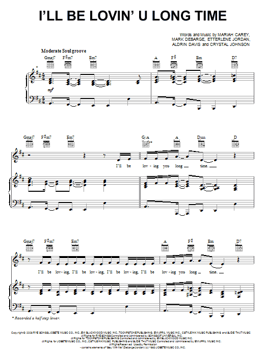Download or print Mariah Carey I'll Be Lovin' U Long Time sheet music, chords and digital score arranged for Piano, Vocal & Guitar Chords (Right-Hand Melody). This Pop score includes 7 page(s).