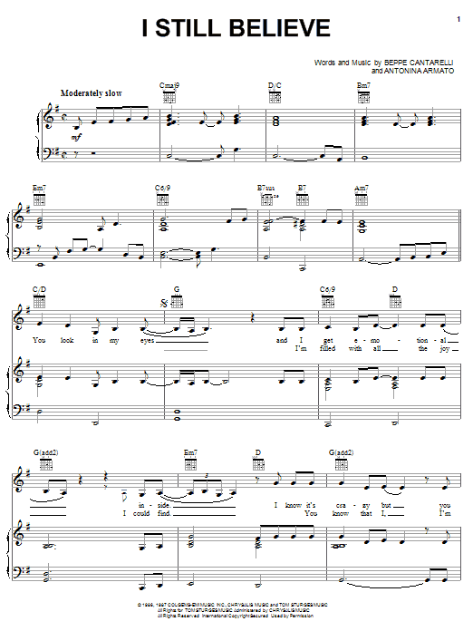 Download or print Mariah Carey I Still Believe sheet music, chords and digital score arranged for Piano, Vocal & Guitar Chords (Right-Hand Melody). This Pop score includes 6 page(s).