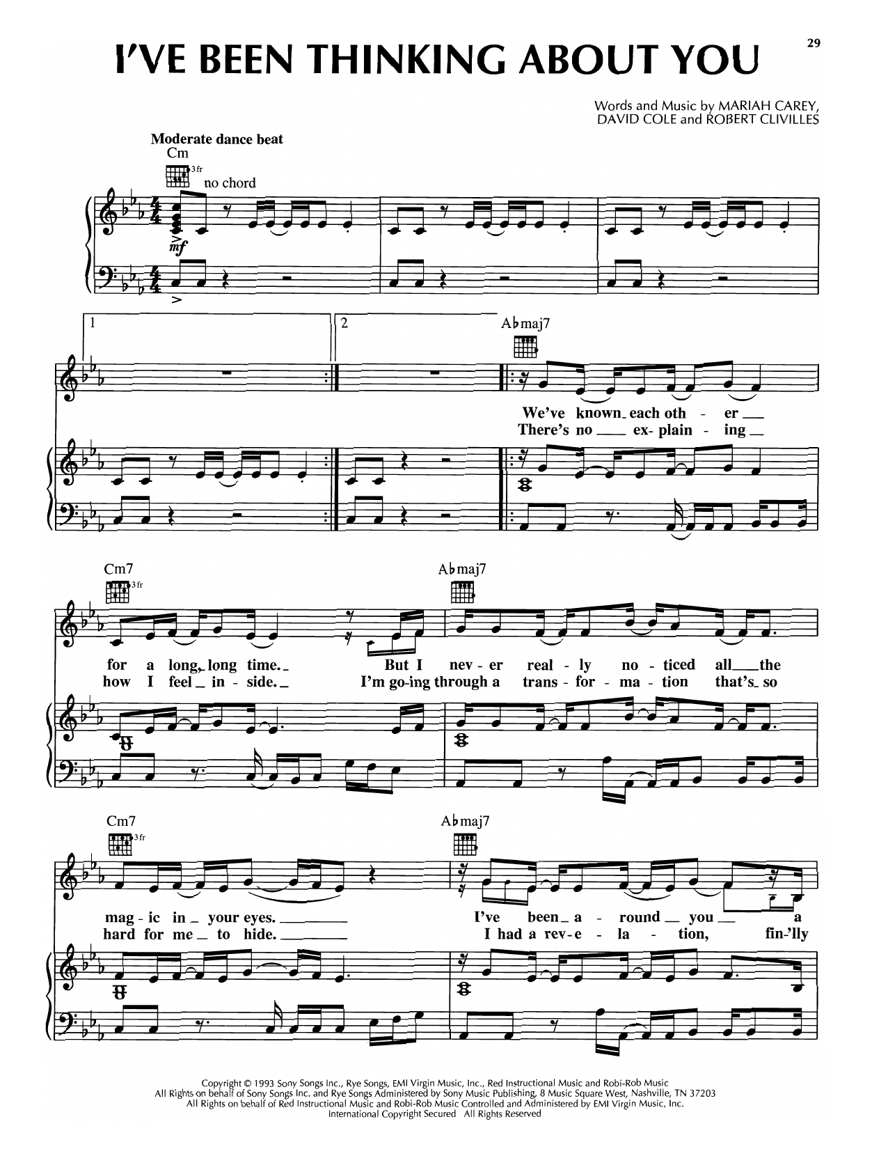 Download or print Mariah Carey I've Been Thinking About You sheet music, chords and digital score arranged for Piano, Vocal & Guitar Chords (Right-Hand Melody). This Pop score includes 7 page(s).