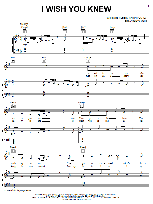 Download or print Mariah Carey I Wish You Knew sheet music, chords and digital score arranged for Piano, Vocal & Guitar Chords (Right-Hand Melody). This Pop score includes 5 page(s).