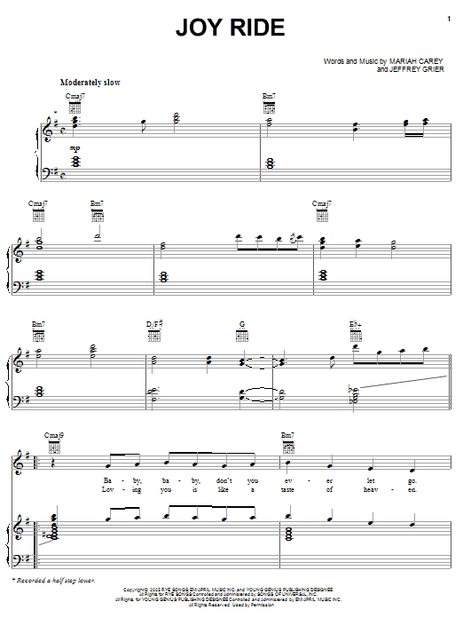 Download or print Mariah Carey Joy Ride sheet music, chords and digital score arranged for Piano, Vocal & Guitar Chords (Right-Hand Melody). This Pop score includes 7 page(s).