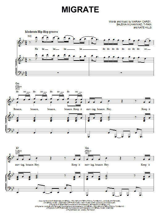 Download or print Mariah Carey Migrate sheet music, chords and digital score arranged for Piano, Vocal & Guitar Chords (Right-Hand Melody). This Pop score includes 10 page(s).