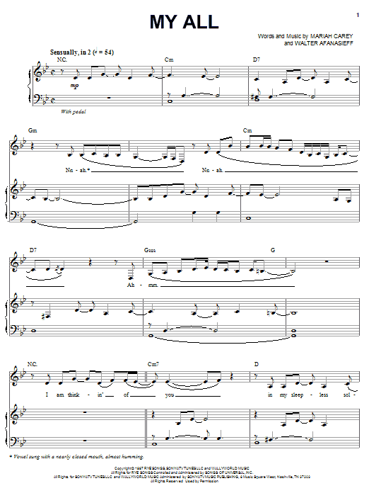 Download or print Mariah Carey My All sheet music, chords and digital score arranged for Piano Chords/Lyrics. This Pop score includes 2 page(s).