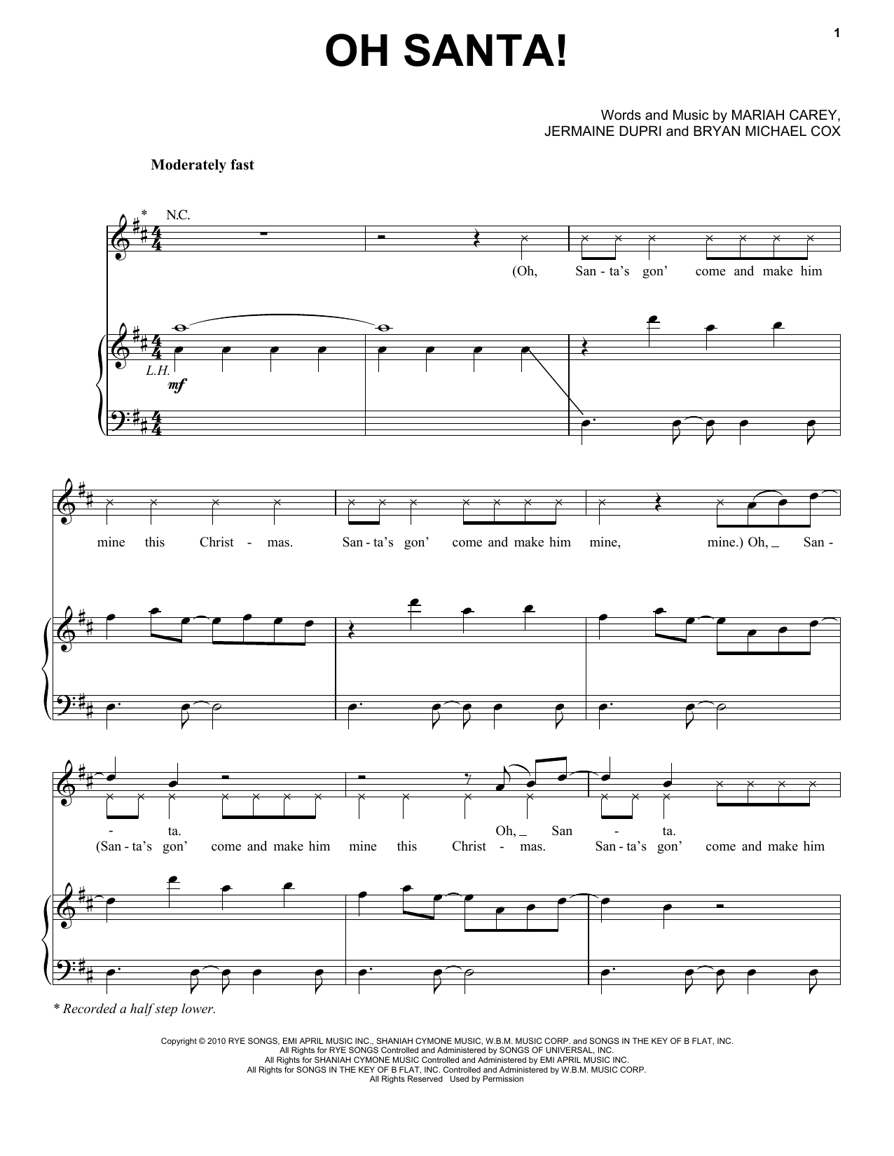 Download or print Mariah Carey Oh Santa! sheet music, chords and digital score arranged for Piano, Vocal & Guitar Chords (Right-Hand Melody). This Christmas score includes 10 page(s).
