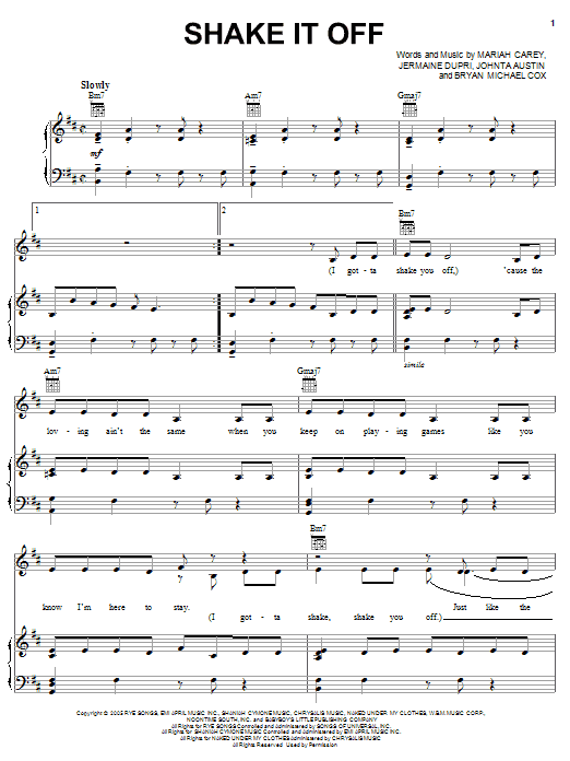Download or print Mariah Carey Shake It Off sheet music, chords and digital score arranged for Easy Piano. This Pop score includes 7 page(s).