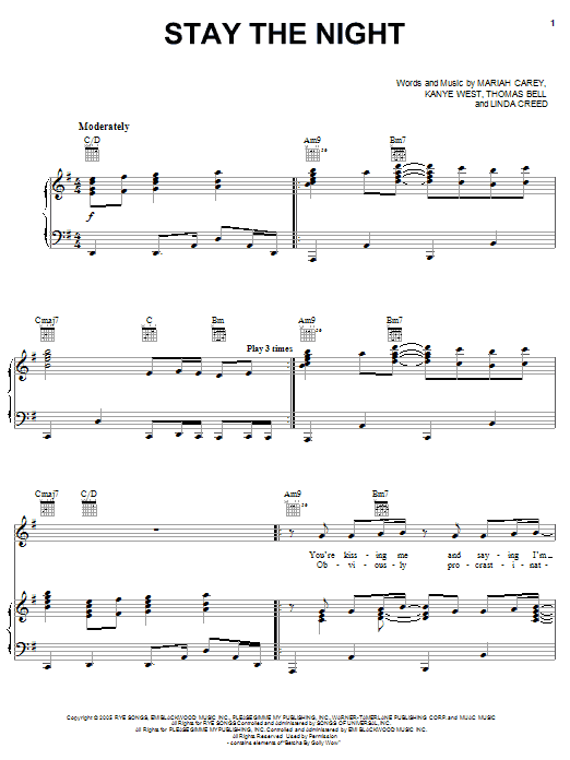 Download or print Mariah Carey Stay The Night sheet music, chords and digital score arranged for Piano, Vocal & Guitar Chords (Right-Hand Melody). This Pop score includes 6 page(s).