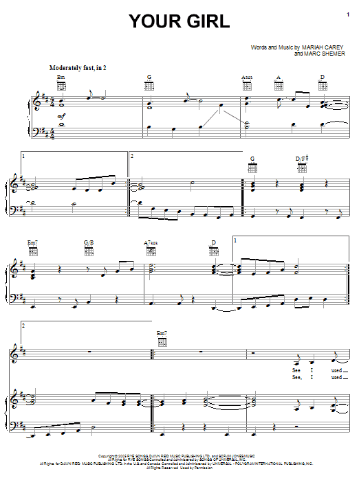 Download or print Mariah Carey Your Girl sheet music, chords and digital score arranged for Piano, Vocal & Guitar Chords (Right-Hand Melody). This Pop score includes 5 page(s).