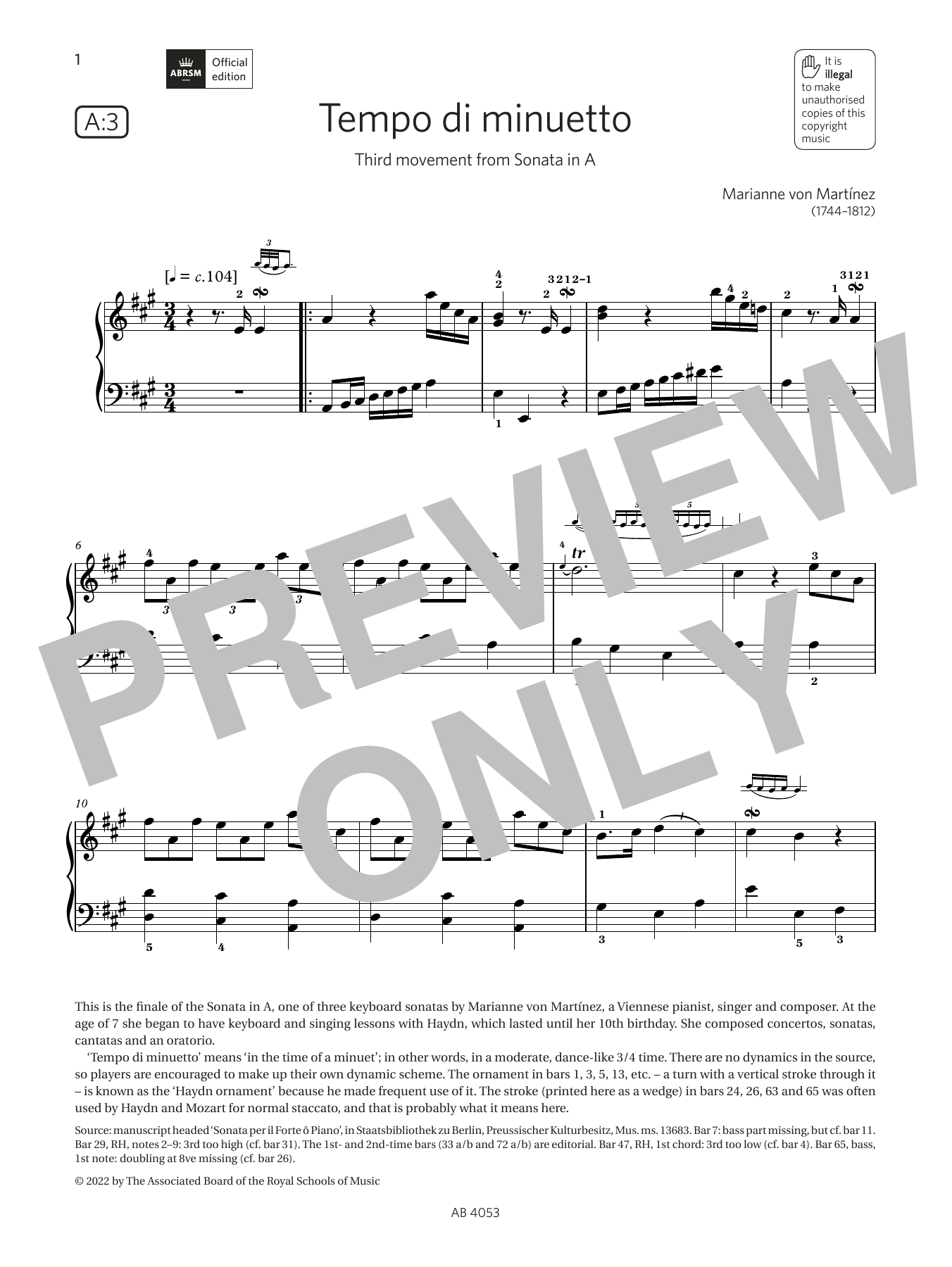 Download or print Marianne von Martínez Tempo di minuetto (Grade 7, list A3, from the ABRSM Piano Syllabus 2023 & 2024) sheet music, chords and digital score arranged for Piano Solo. This Classical score includes 4 page(s).