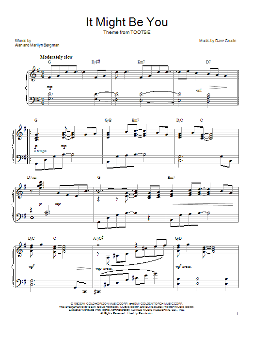 Download or print Marilyn Bergman It Might Be You sheet music, chords and digital score arranged for Piano Solo. This Film/TV score includes 3 page(s).