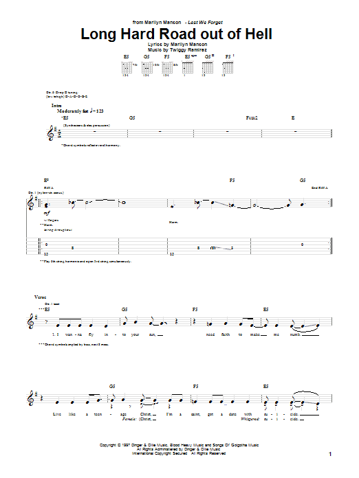 Download or print Marilyn Manson Long Hard Road Out Of Hell sheet music, chords and digital score arranged for Guitar Tab. This Metal score includes 11 page(s).