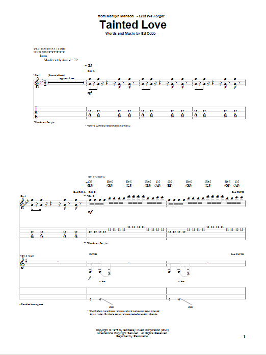 Download or print Marilyn Manson Tainted Love sheet music, chords and digital score arranged for Guitar Tab. This Metal score includes 6 page(s).