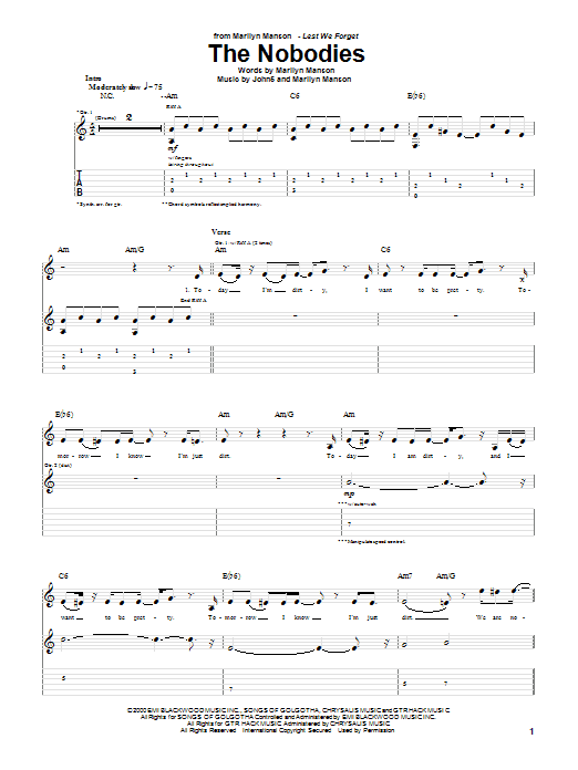 Download or print Marilyn Manson The Nobodies sheet music, chords and digital score arranged for Guitar Tab. This Metal score includes 5 page(s).