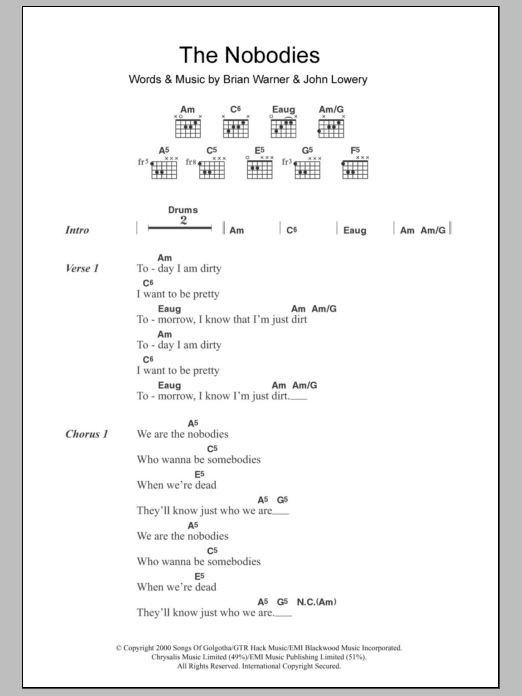 Download or print Marilyn Manson The Nobodies sheet music, chords and digital score arranged for Guitar Chords/Lyrics. This Rock score includes 3 page(s).