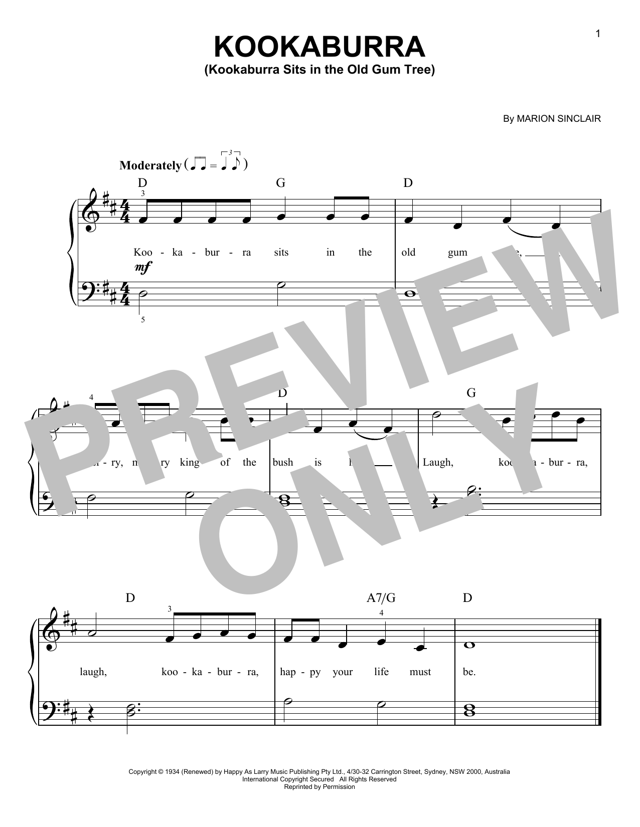 Download or print Marion Sinclair Kookaburra (Kookaburra Sits In The Old Gum Tree) sheet music, chords and digital score arranged for Easy Piano. This Children score includes 1 page(s).