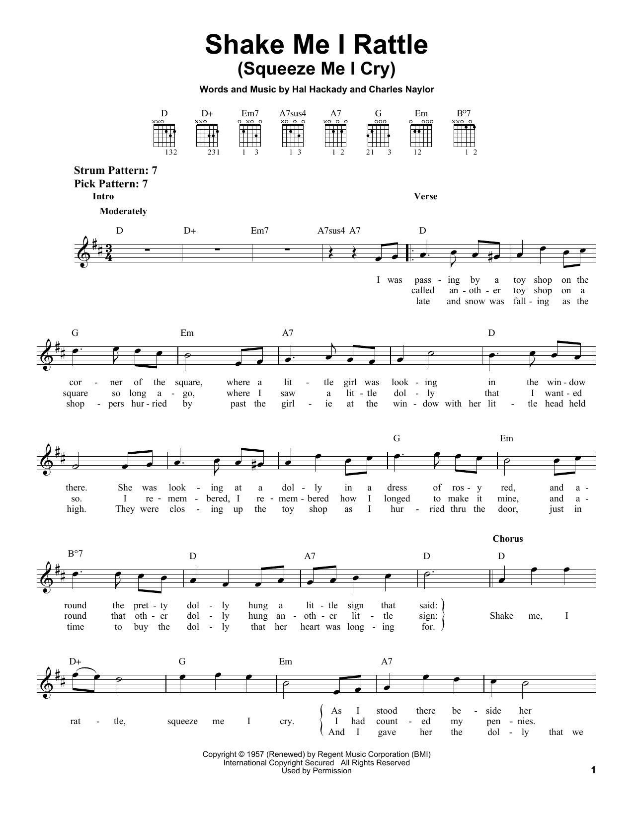 Download or print Marion Worth Shake Me I Rattle (Squeeze Me I Cry) sheet music, chords and digital score arranged for Piano, Vocal & Guitar Chords (Right-Hand Melody). This Christmas score includes 3 page(s).
