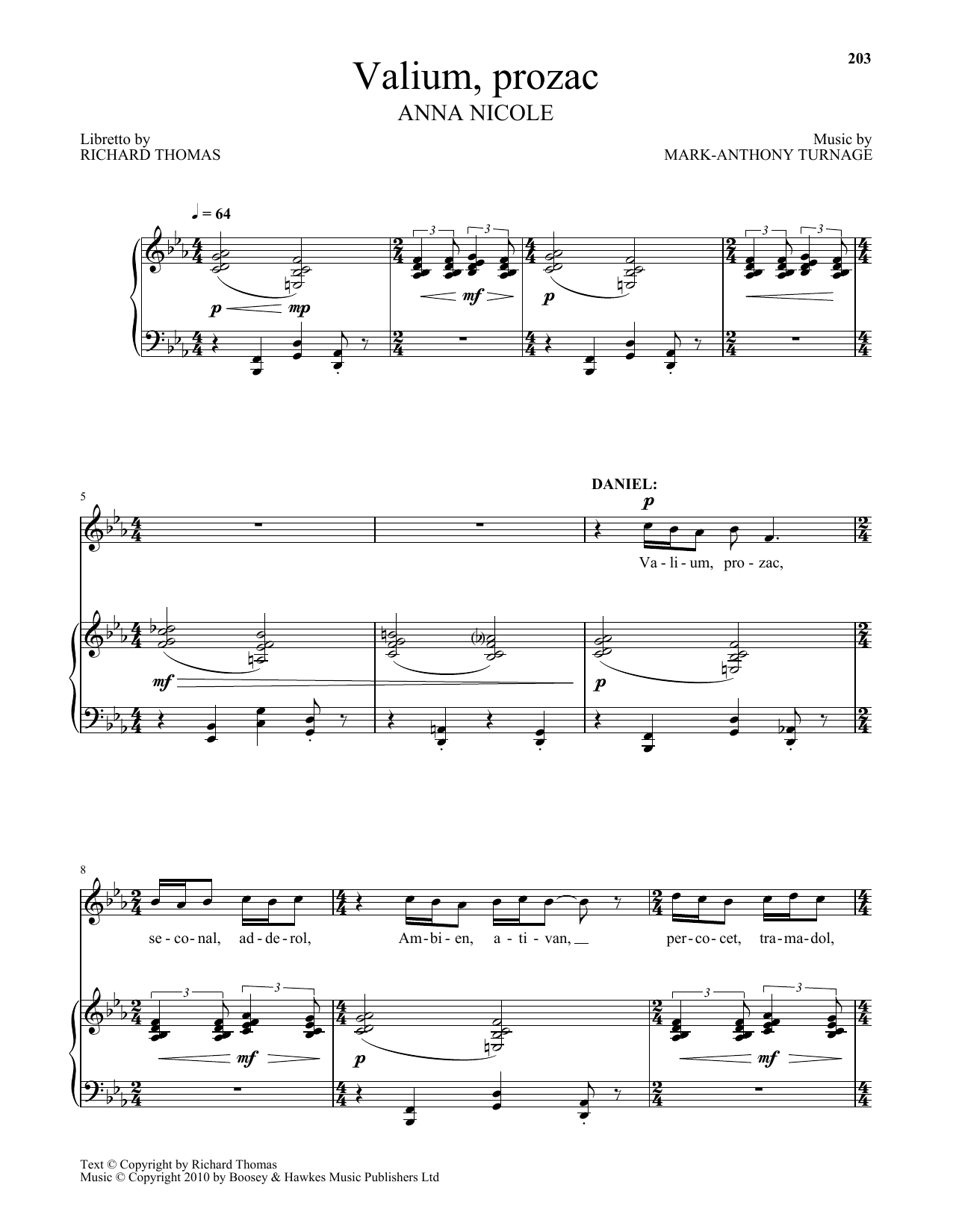 Download or print Mark-Anthony Turnage Valium, Prozac sheet music, chords and digital score arranged for Piano & Vocal. This Classical score includes 3 page(s).