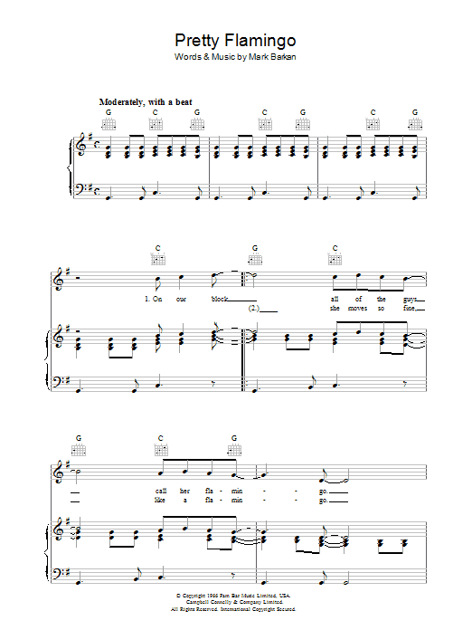 Download or print Mark Barkan Pretty Flamingo sheet music, chords and digital score arranged for Piano, Vocal & Guitar Chords. This Pop score includes 4 page(s).
