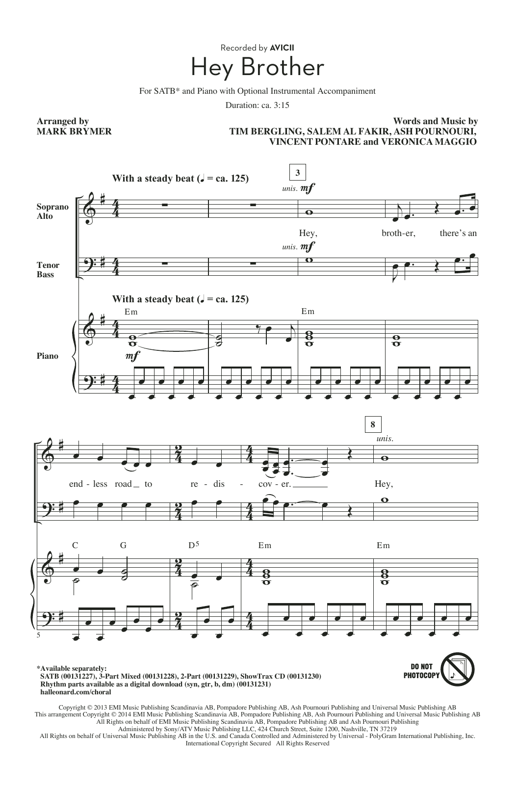 Download or print Mark Brymer Hey Brother sheet music, chords and digital score arranged for SATB Choir. This Pop score includes 11 page(s).