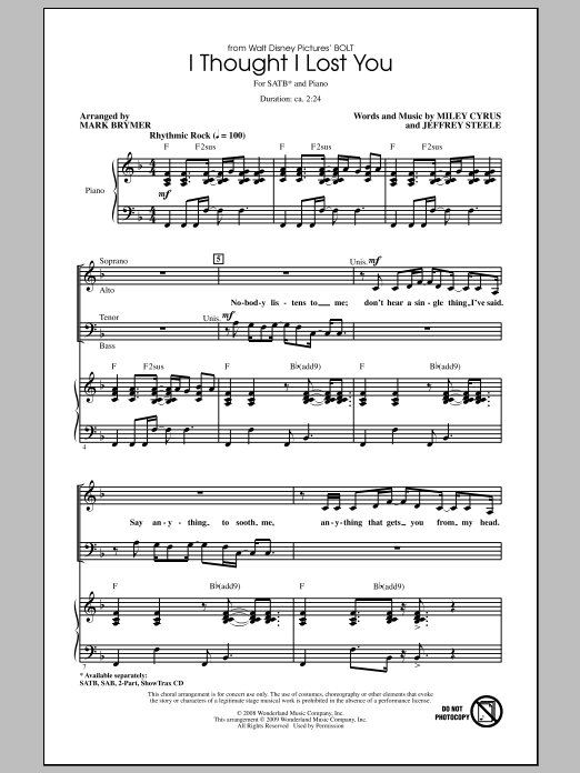 Download or print Mark Brymer I Thought I Lost You (from Bolt) sheet music, chords and digital score arranged for SAB Choir. This Disney score includes 7 page(s).