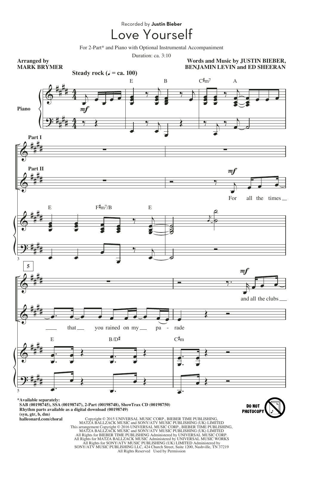Download or print Justin Bieber Love Yourself (arr. Mark Brymer) sheet music, chords and digital score arranged for SSA Choir. This Pop score includes 11 page(s).