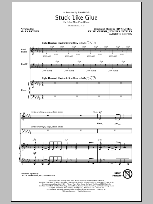 Download or print Mark Brymer Stuck Like Glue sheet music, chords and digital score arranged for SSA Choir. This Country score includes 13 page(s).