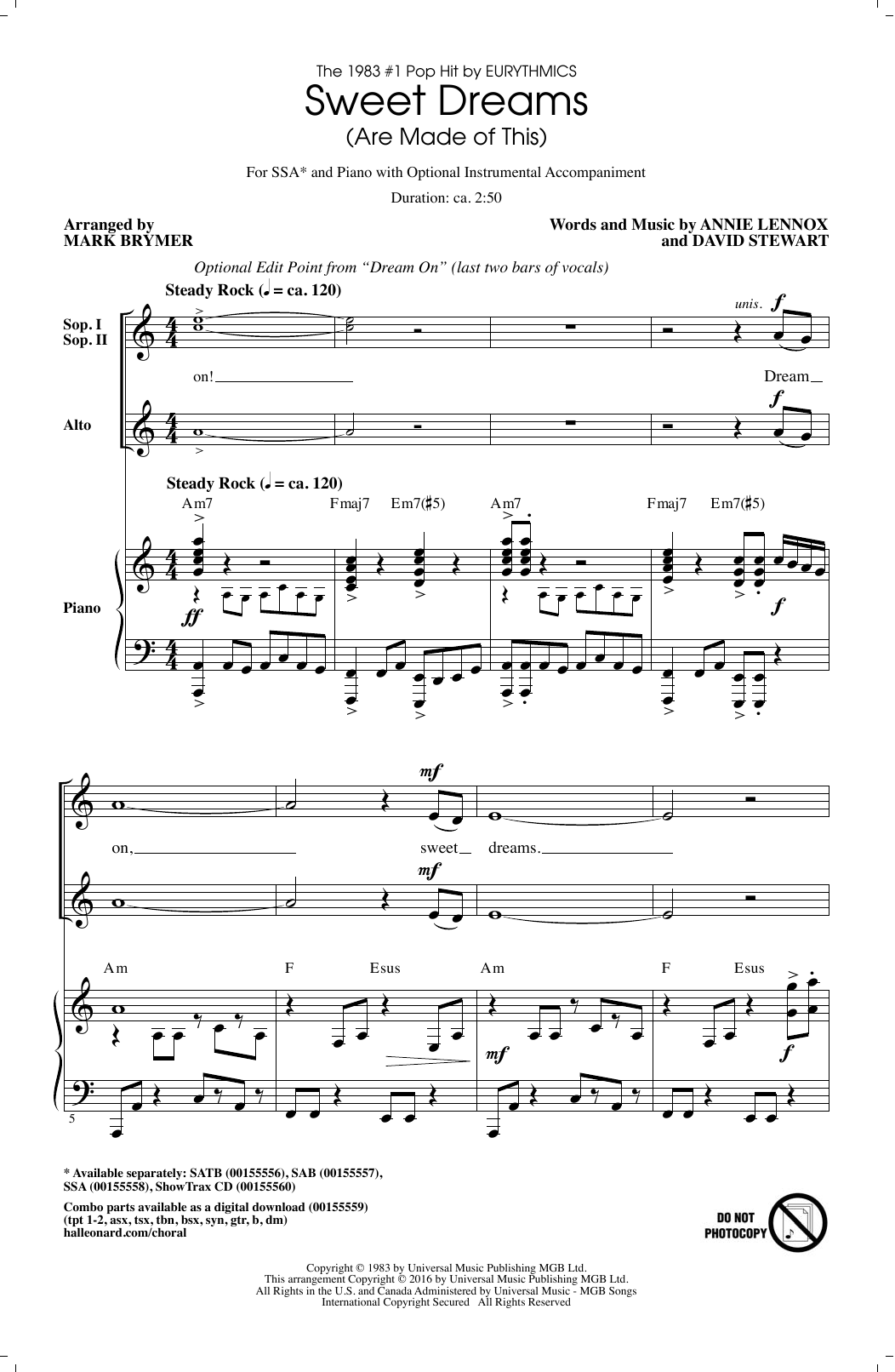 Download or print Mark Brymer Sweet Dreams (Are Made Of This) sheet music, chords and digital score arranged for SAB Choir. This Pop score includes 10 page(s).