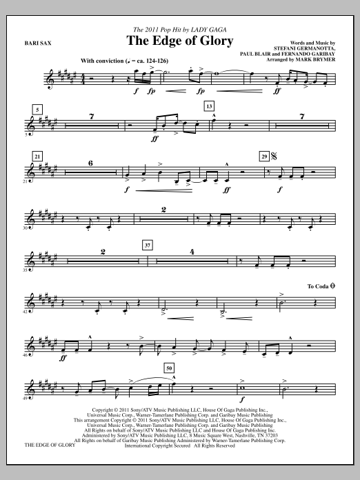 Download or print Mark Brymer The Edge Of Glory - Baritone Saxophone sheet music, chords and digital score arranged for Choir Instrumental Pak. This Pop score includes 2 page(s).
